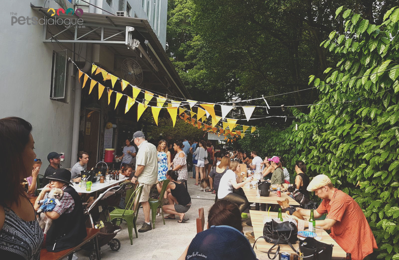 by rows of picnic tables and long benches, filled up by Pet owners and their